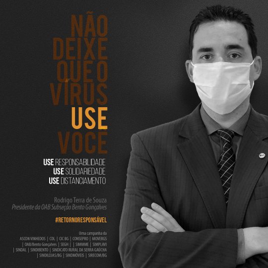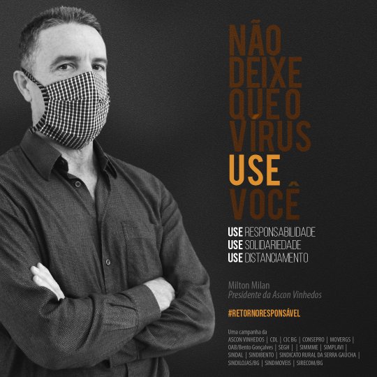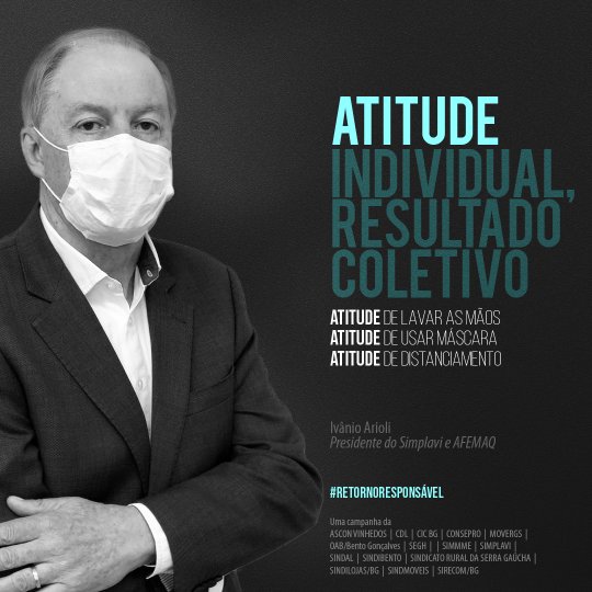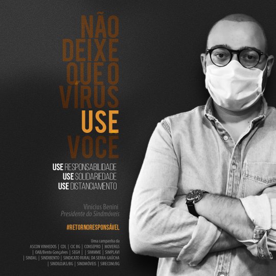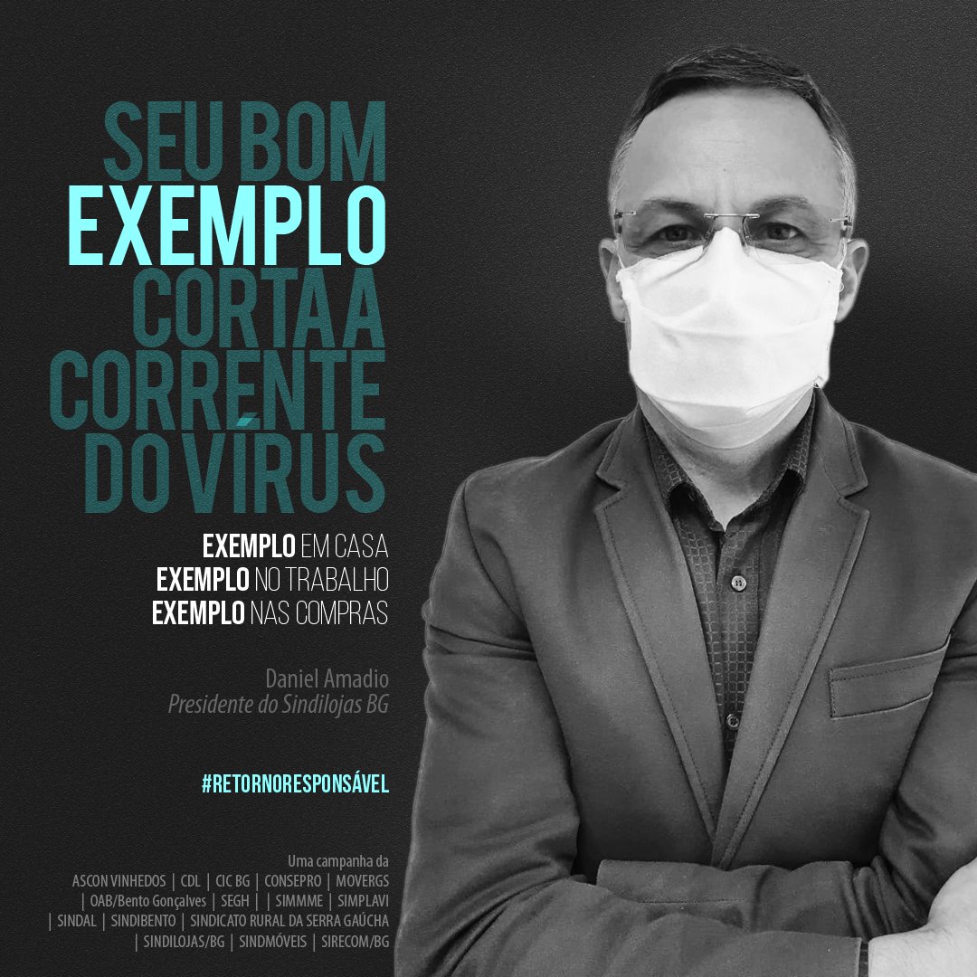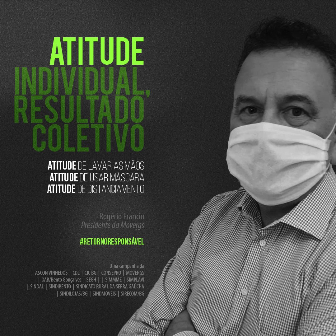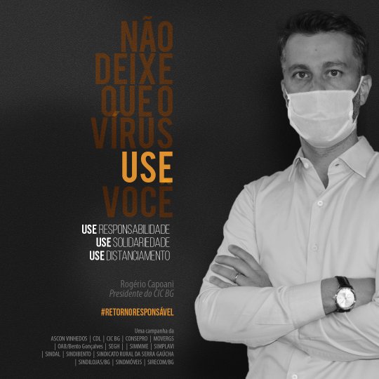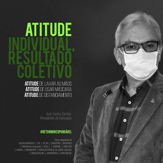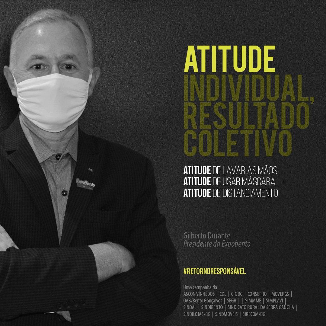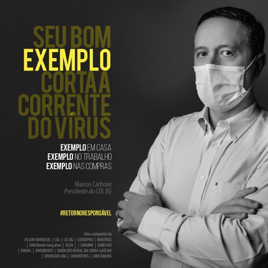 A iniciativa traz os presidentes de 15 entidades de Bento Gonçalves como porta-vozes do retorno responsável, reforçando que a atitude individual traz benefícios coletivos nesses tempos de pandemia. “Seu bom exemplo corta a corrente do vírus”, diz uma das imagens. “Vista a máscara e o bom senso”, clama outra. Todos estão sendo convidados a participarem do #retornoresponsavel fazendo a sua parte e compartilhando os cards na internet.
